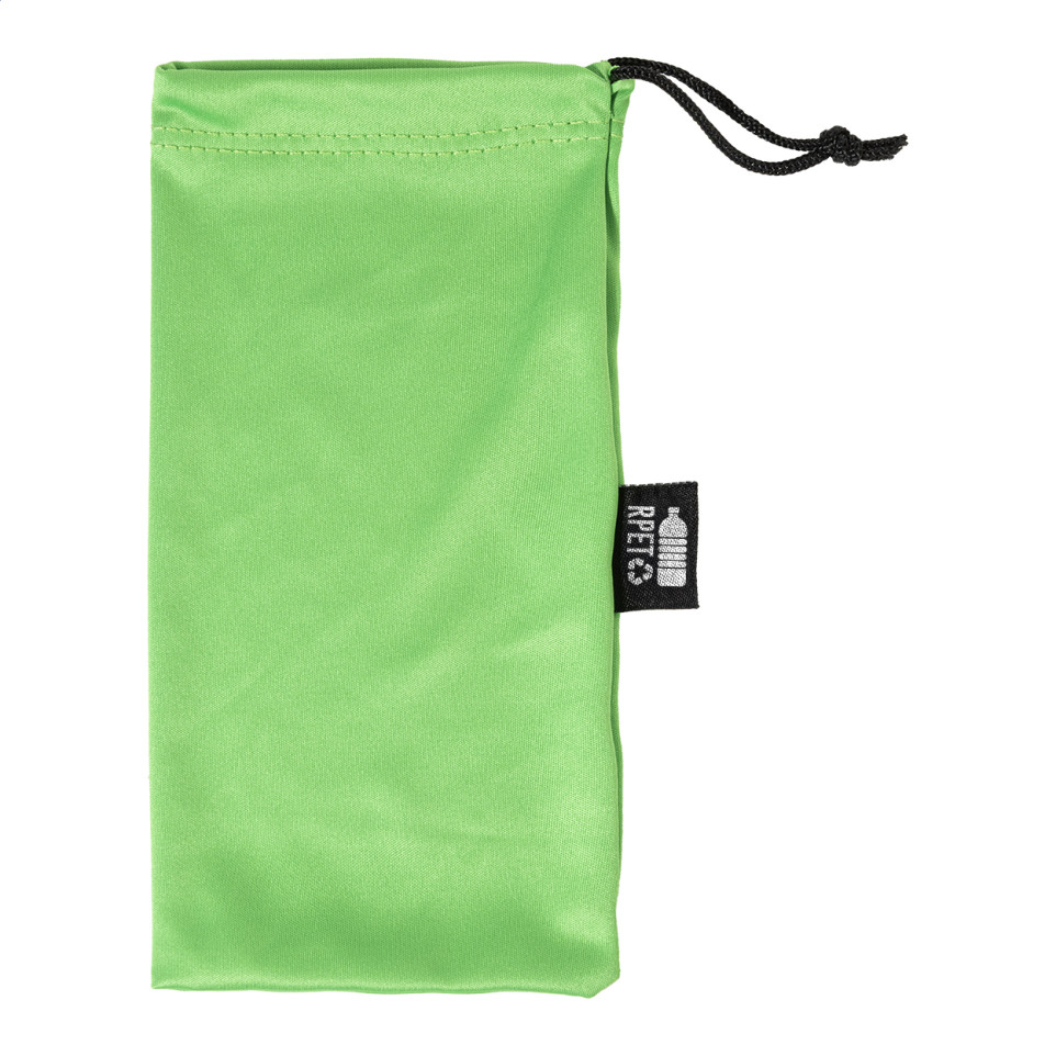 A green drawstring sunglasses case crafted from RPET polyester, designed to protect eyewear while reflecting a commitment to sustainable and recycled materials.
