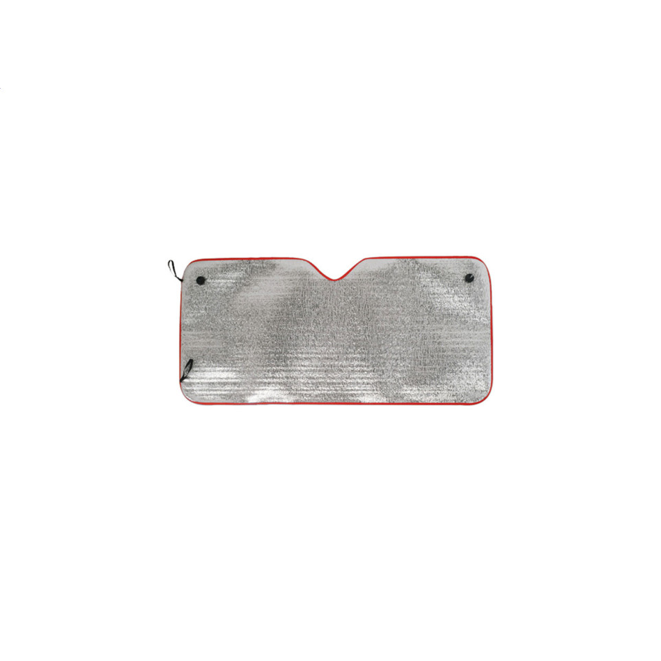 Aluminium car sunshade for windshield designed in red and silver, equipped with two suction cups for secure placement. Effectively shields the vehicle interior from sunlight and heat, keeping the cabin cooler during sunny days. Minimum order quantity: multiples of 100 pieces.