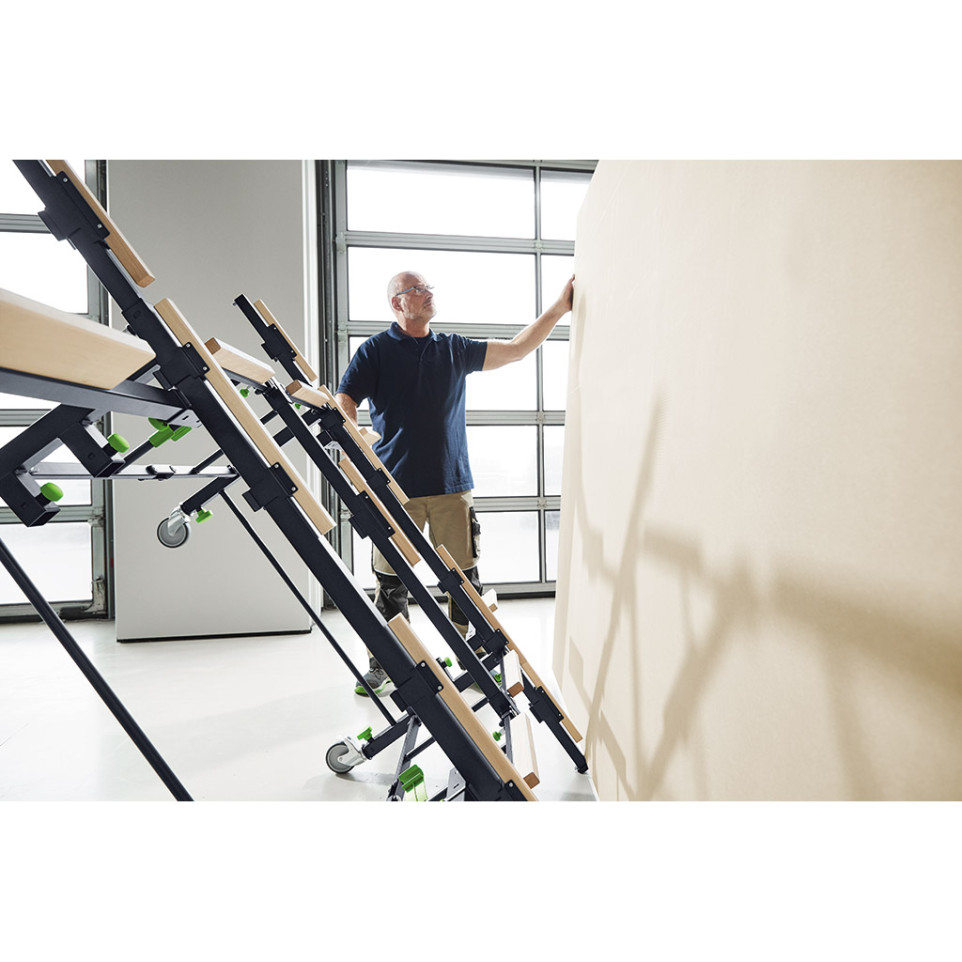 The Festool STM 1800 is a mobile sawing and work table engineered for precise, ergonomic cutting and handling of large panels or sheet material. Designed for both workshop and construction site environments, it enables a single user to position, secure, and machine panels up to 3100 x 2150 mm with ease.
