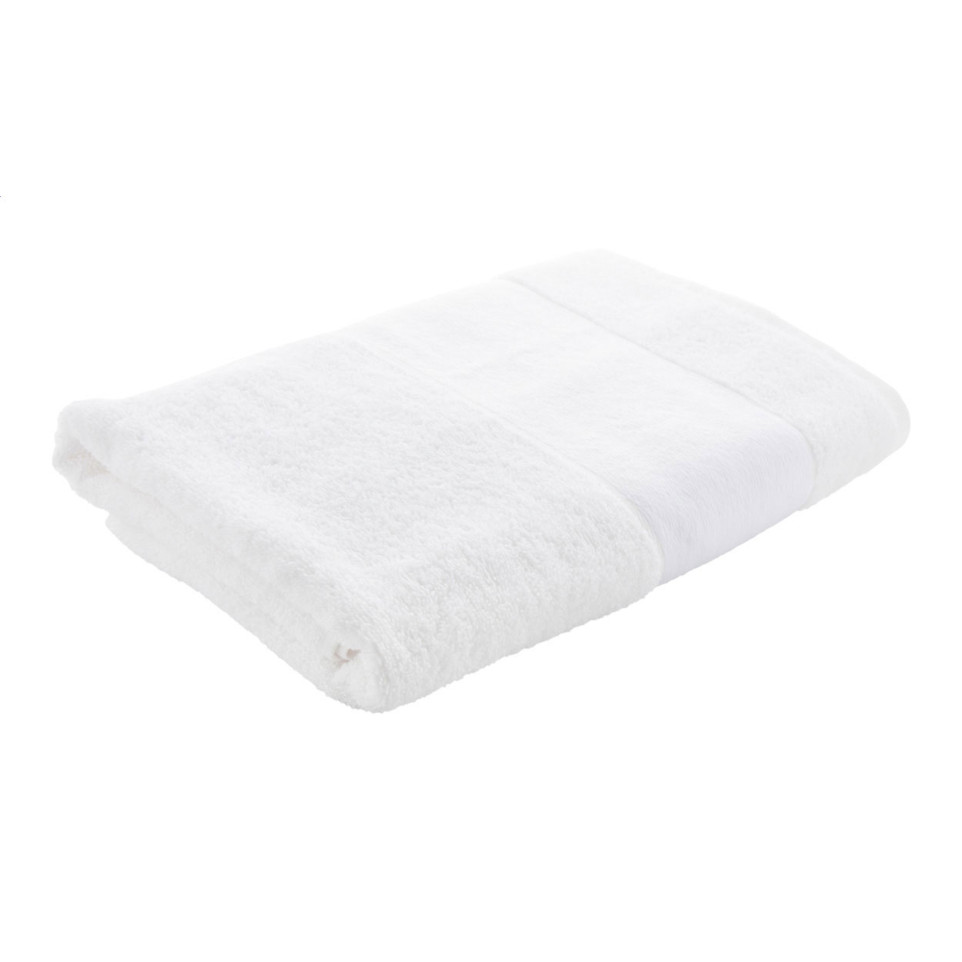 Large, white terry towel made from 100% cotton, featuring a polyester border designed for high-quality sublimation printing. Suitable for wellness, fitness, hospitality, and promotional use.