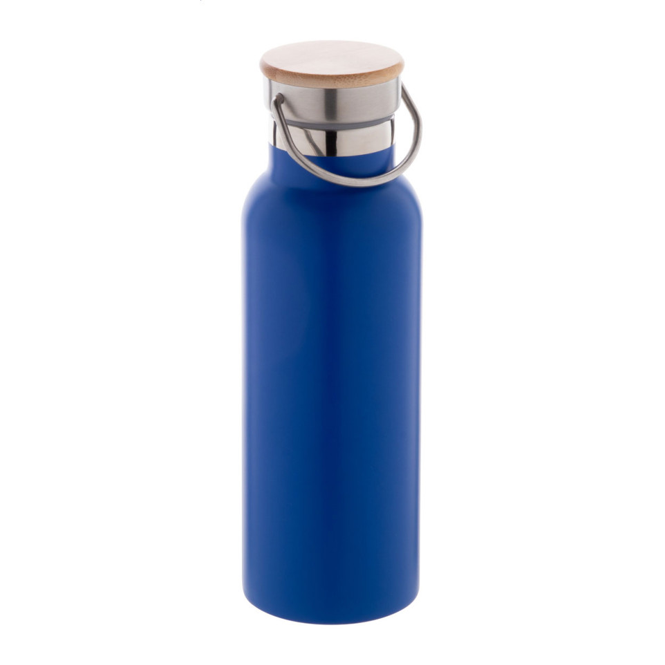 The bottle is made of double-wall stainless steel and features a bamboo carry lid.