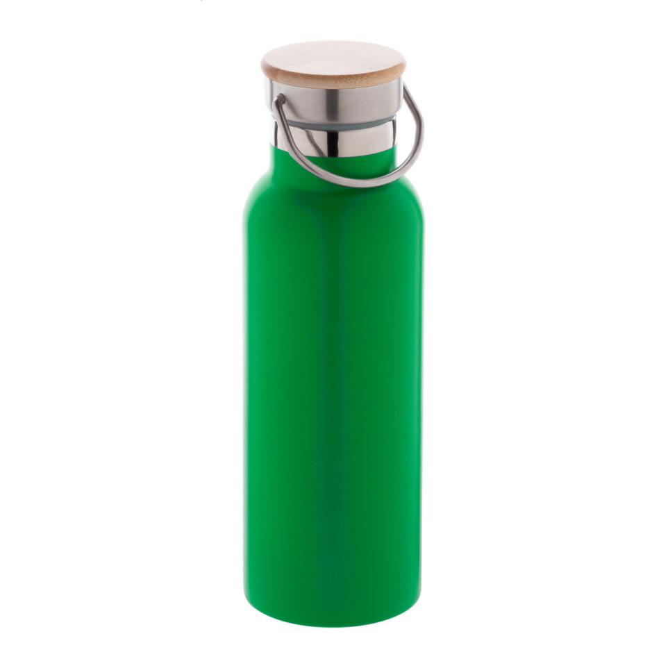 The Manaslu green insulated bottle is a 500 ml double-wall stainless steel vacuum bottle with a bamboo carry lid, designed for everyday hydration at the office, gym, or while traveling.