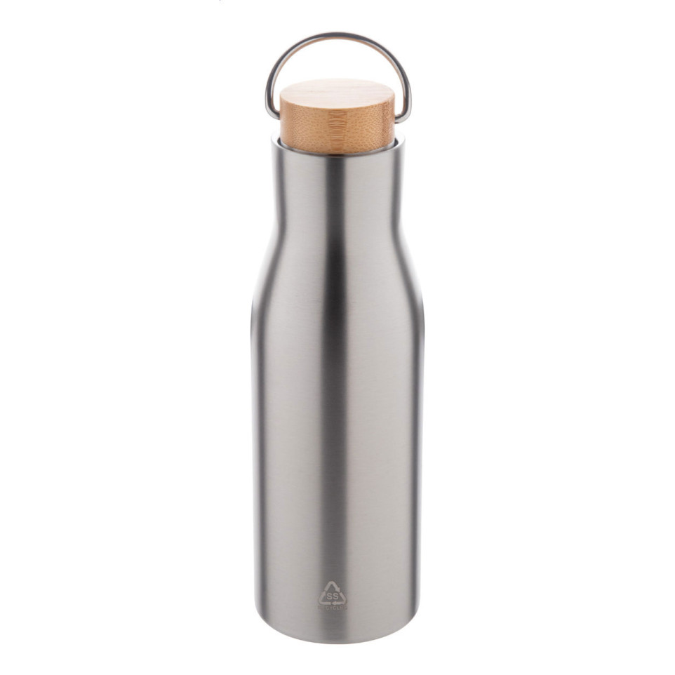 Ressobo silver insulated bottle combines elegance and functionality with its sleek recycled stainless steel design and bamboo carry lid. Perfect for keeping beverages at ideal temperatures during commutes, outdoor activities, or long workdays.