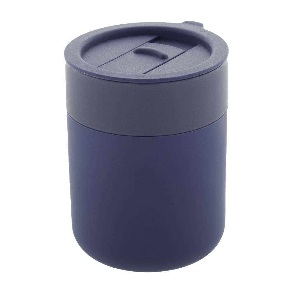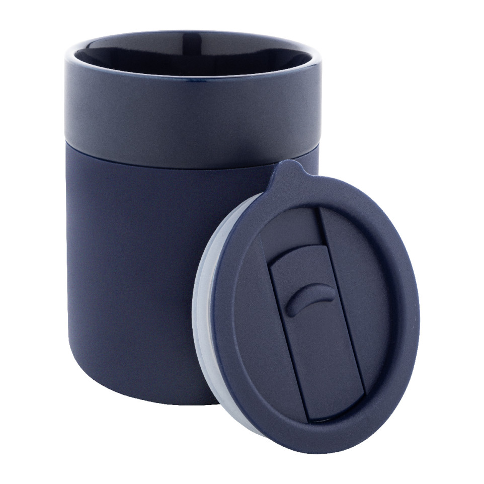 The Liberica dark blue travel cup is a silicone-covered ceramic mug designed for on-the-go beverage enjoyment. With a 300 ml capacity and secure PP plastic drinking lid, it offers both style and practicality for daily commuters and travelers.