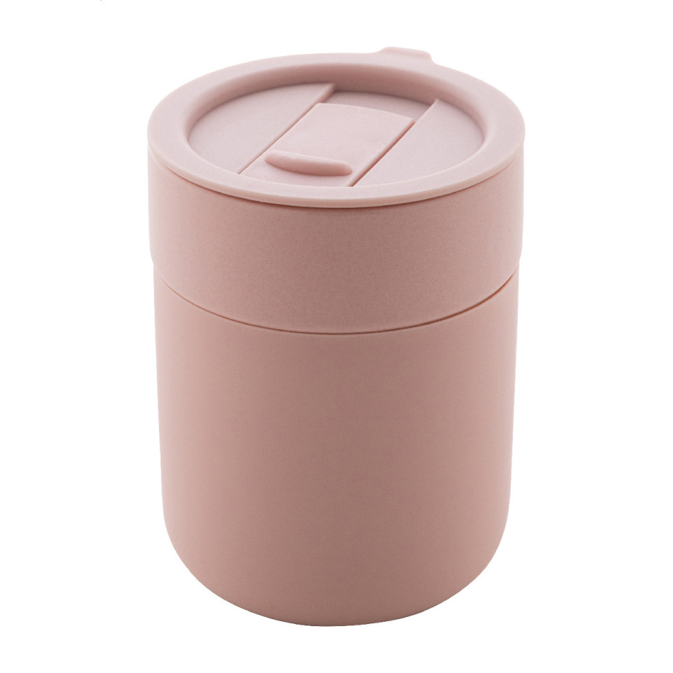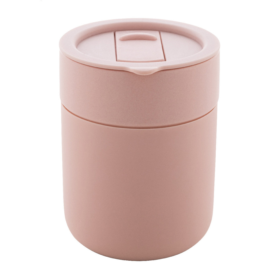 Liberica Light Rose Travel Cup is a 300 ml silicone-covered ceramic mug designed for mobility. It features a secure PP plastic drinking lid and is ideal for both hot and cold drinks on the go.