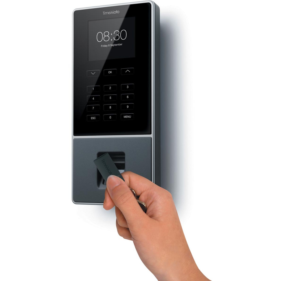 The Safescan TimeMoto 626 is a complete time recording solution that combines a fingerprint reader, RFID badge capability, and PIN entry, designed for seamless employee attendance tracking in small to medium-sized businesses.
