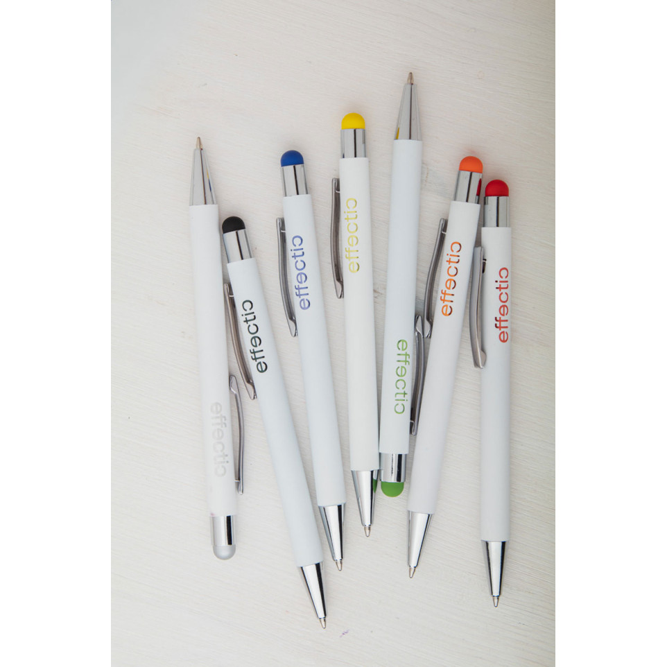 Red and white Wirly ballpoint pen with integrated touchscreen stylus, crafted from aluminum. Ideal for everyday writing and seamless device navigation in professional or personal settings.