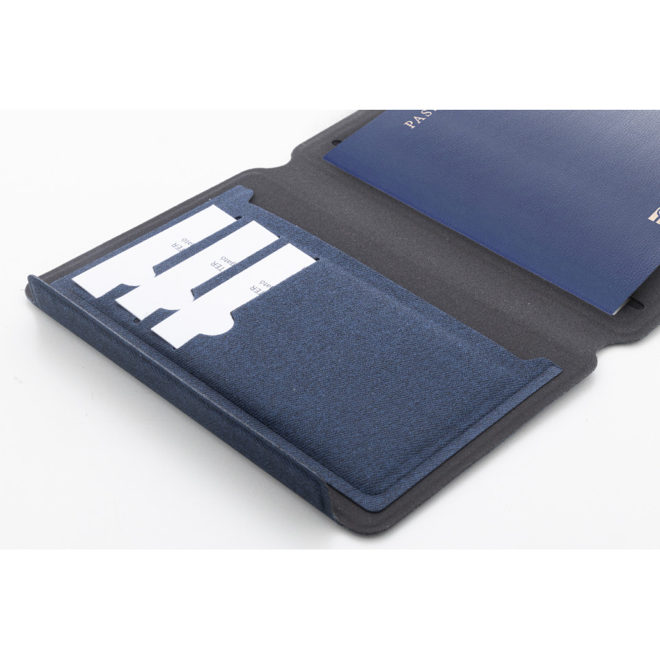 The Passpu blue RPU passport case is a recycled PU leather holder designed to keep your passport and travel cards organized and secure. Suitable for travel, it features integrated card pockets and a magnetic closure for easy access.