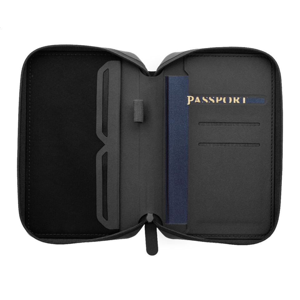 The organizer features several interior pockets to store documents, cards, a passport, and other travel essentials.