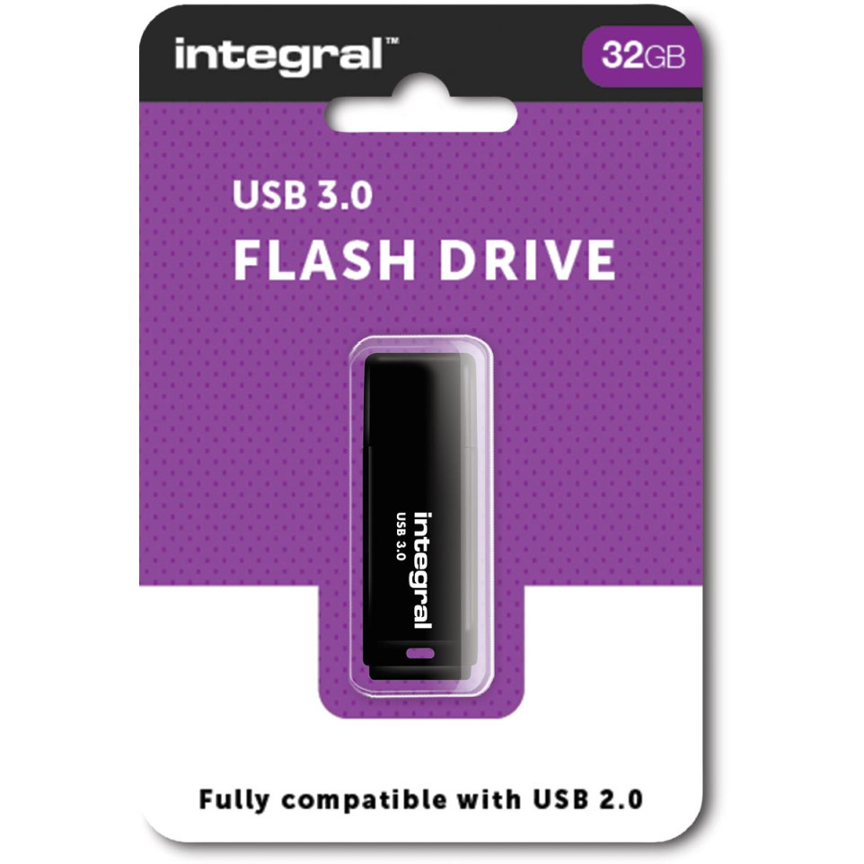 The Integral Black USB 3.0 32 GB flash drive stores and transfers files efficiently. Plug it into PC or Mac for quick access to documents, photos, and videos on the go.[1][4]