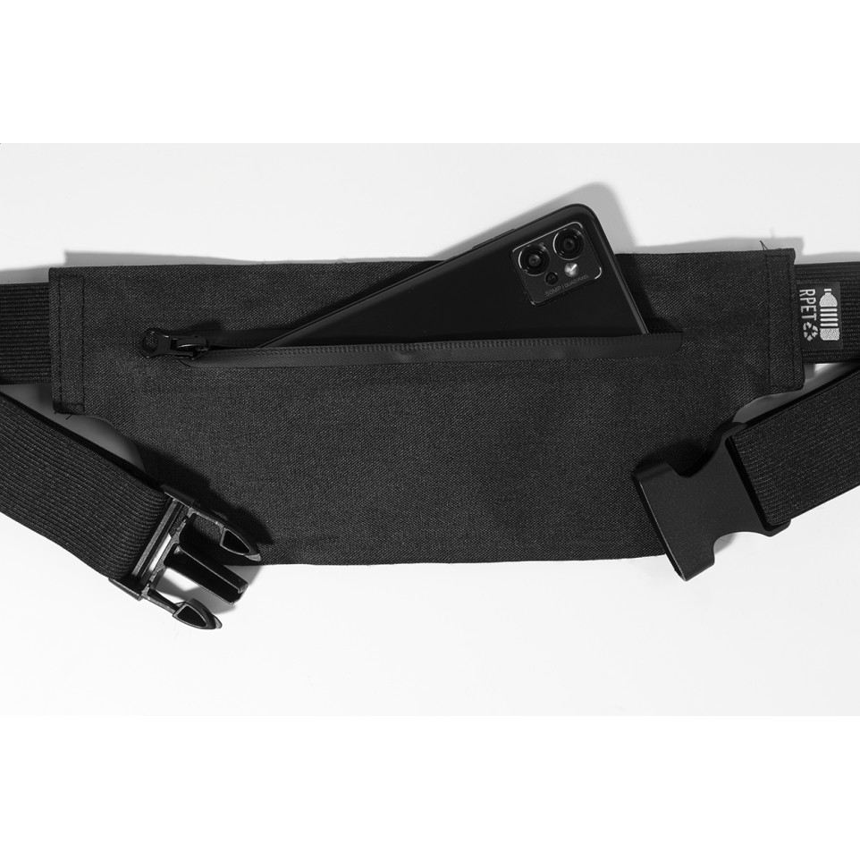 Slim RPET waist bag in black, featuring a zipped compartment and adjustable elastic strap. Ideal for hands-free carrying of essentials during travel, daily activities, or active wear.