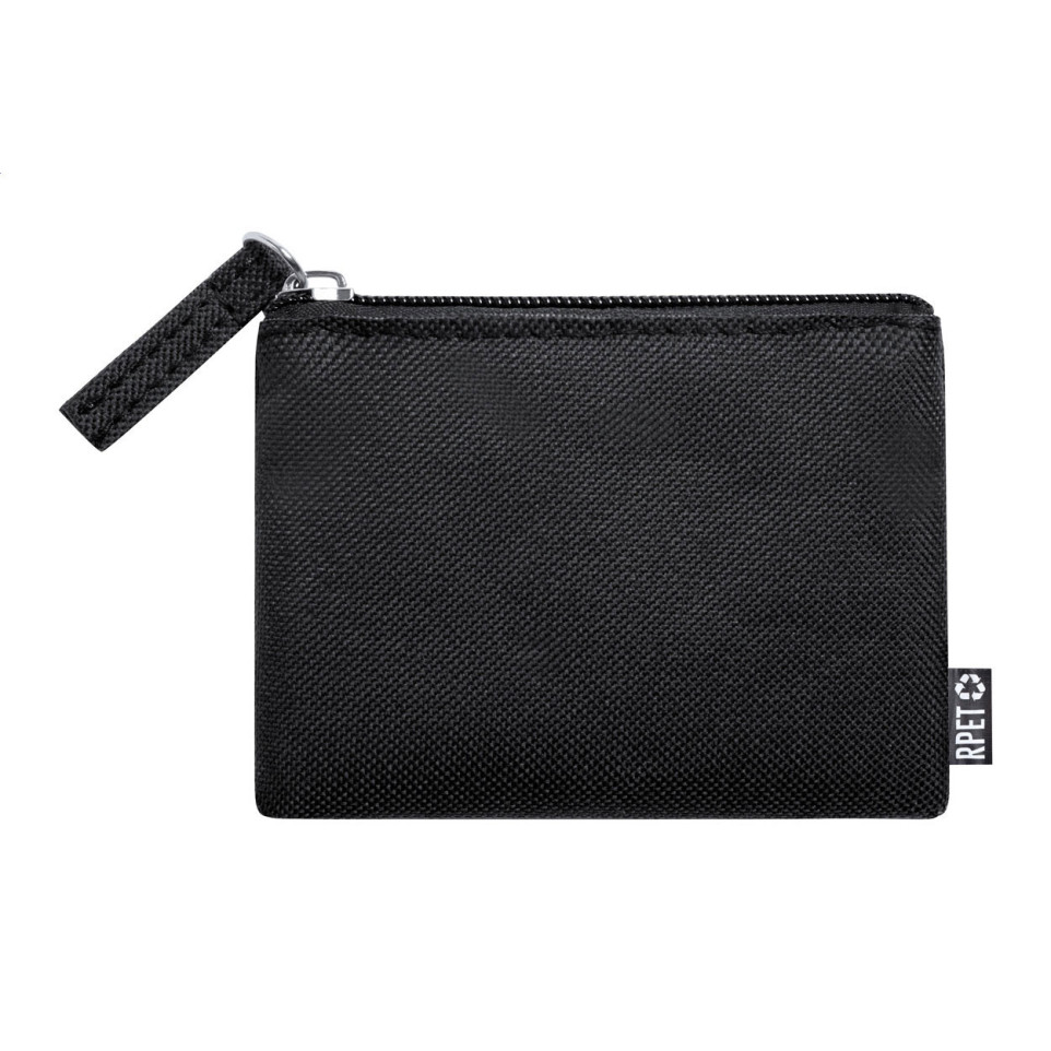The Dirham black RPET purse is a compact, eco-friendly zipped pouch crafted from recycled materials. Perfect for storing small essentials like coins, cards, or personal items while showcasing environmental responsibility.