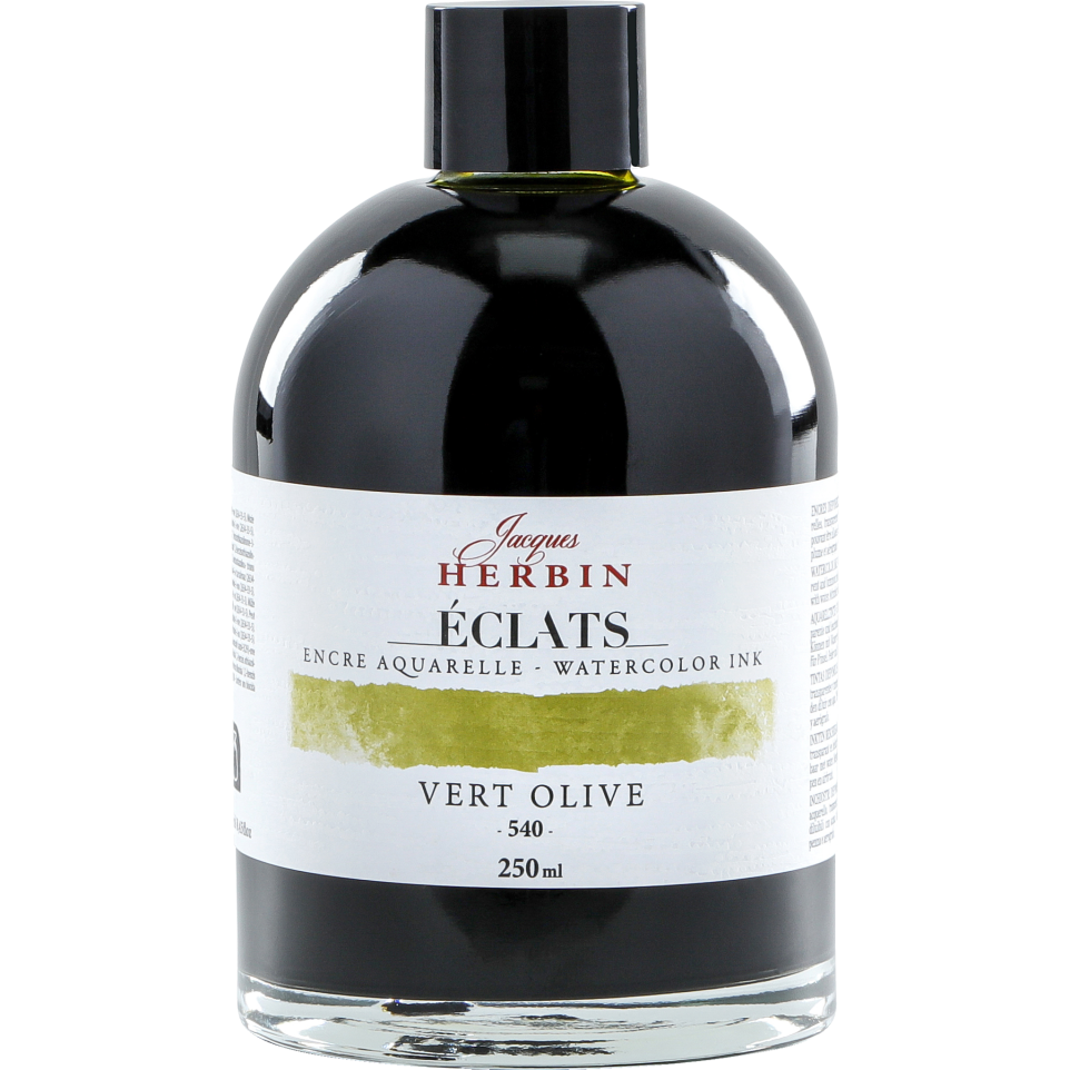 Encre aquarelle Eclats en 250ml Gamme d'encres pour artistes de 63 couleurs. 62 teintes aquarelles sont à base de colorants, elles sont uniques, lumineuses, intenses et transparentes. Encres miscibles entre elles et pouvant être utilisées telles quelles ou diluées pour donner naissance à une multitude de nouvelles nuances des plus vives au plus pastelles. La couleur blanche est pigmentée, opaque et couvrante et à utiliser, de préférence, concentrée. L'encre Eclats est à utiliser de préférence au pinceau, à l'aérographe voire au porte-plume sur du papier aquarelle et du carton. Flacon en verre avec une large base pour permettre une stabilité optimale sur la table de l'artiste. Les teintes sont disponibles en flacon de 50ml (70 couleurs) et 1000ml (5 couleurs). Fabrication en France. Livré par 2.