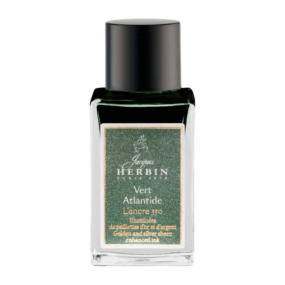 Encre 350 à paillettes dorées et argentées 15ml L'encre 350, de la Collection exclusive Jacques Herbin Prestige, célèbre en cette année anniversaire la date du lancement de la maison Jacques Herbin à Paris en 1670. Cette encre végane est destinée à être utilisée au stylo-plume, stylo roller, plume de verre et porte-plume. Cette encre 350 est végane et elle destinée pour une utilisation au stylo-plume, au stylo roller, à la plume de verre et au porte-plume. Ce flacon, en verre, très élégant, de 15ml vous permettra de le transporter facilement partout pour illuminer tous vos écrits. L'encre Vert Atlantide, de couleur sombre et intense, est illuminée de paillettes d'argent et d'or. Cette encre est un hommage au navigateur Jacques Herbin dont la légende raconte son intérêt pour les lieux disparus tels que l'Antlantide. Fabriqué en France.