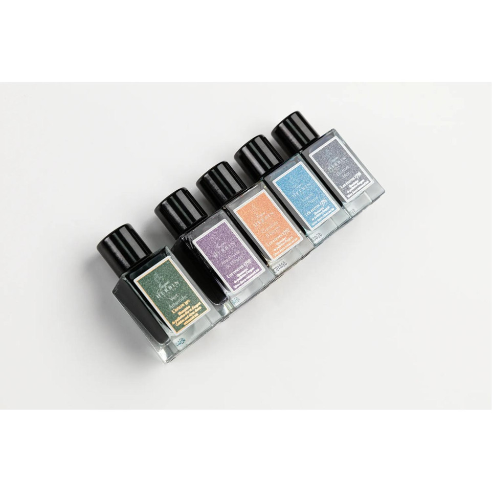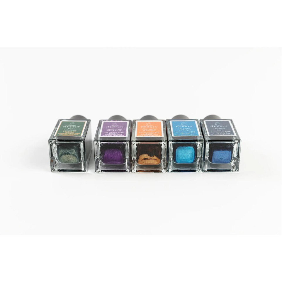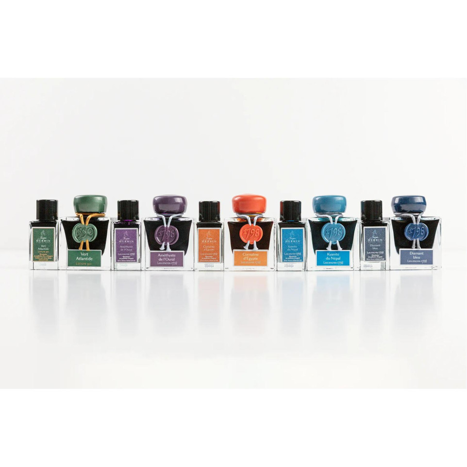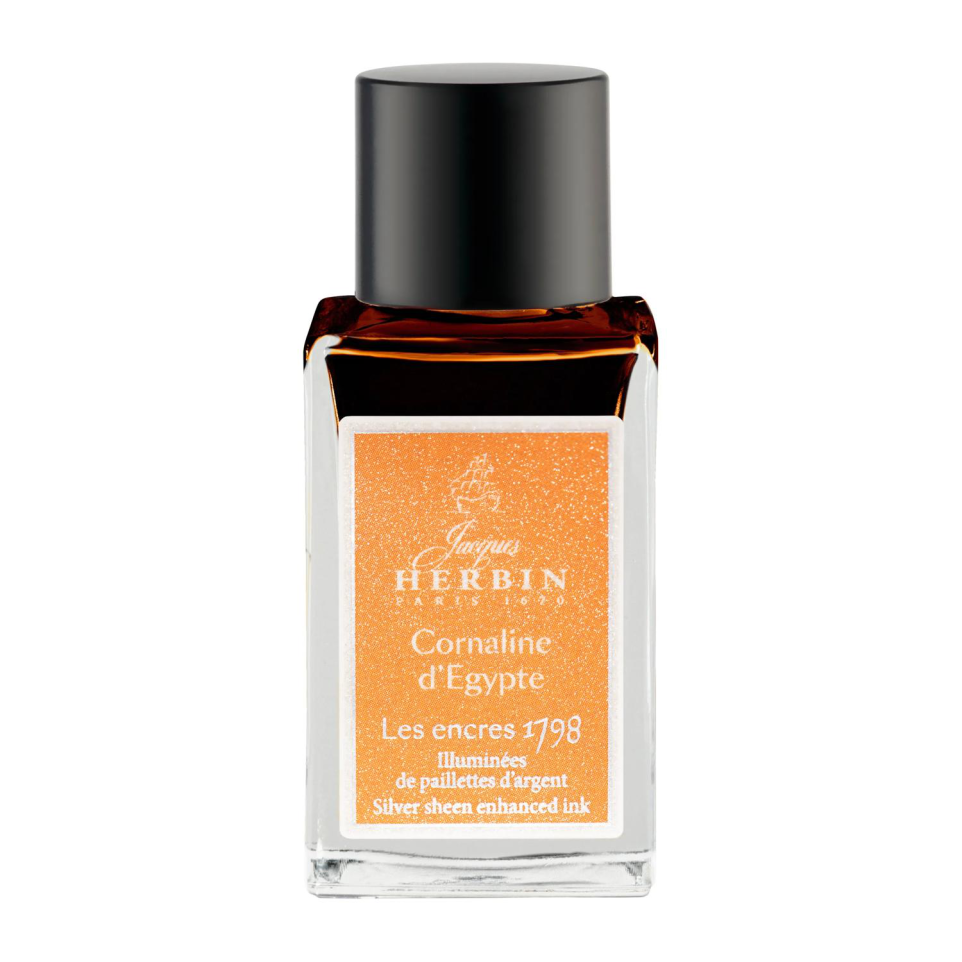 Encre 1798 à paillettes argentées 15ml  Les Encres 1798, de la Collection exclusive Jacques HERBIN Prestige, fêtent la date de production originale des encres Jacques HERBIN, événement décisif dans l'histoire de la maison fondée en 1670. Ces couleurs intenses et profondes sont illuminées du miroitement de paillettes argentées. Les encres 1798 sont véganes et sont pour stylo-plume, stylo roller, plume de verre et porte-plume. Ce flacon, en verre, très élégant, de 15ml vous permettra de le transporter facilement partout pour illuminer tous vos écrits. La cornaline d'Egypte de couleur ocre, inspirée de la pierre précieuse, est sublimée grâce à ses paillettes argentées qui brillent de mille feux. Elle apporte ainsi chaleur et élégance aux différents écrits. Fabriqué en France.