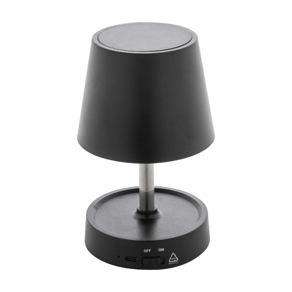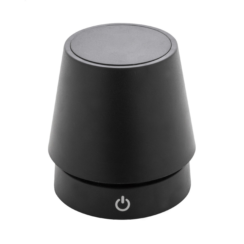 Versatile telescopic bar table lamp in black recycled ABS, featuring 12 LEDs with adjustable brightness, ideal for enhancing ambiance in wine bars, hospitality venues, or promotional spaces. Rechargeable 1200 mAh battery with USB cable included.