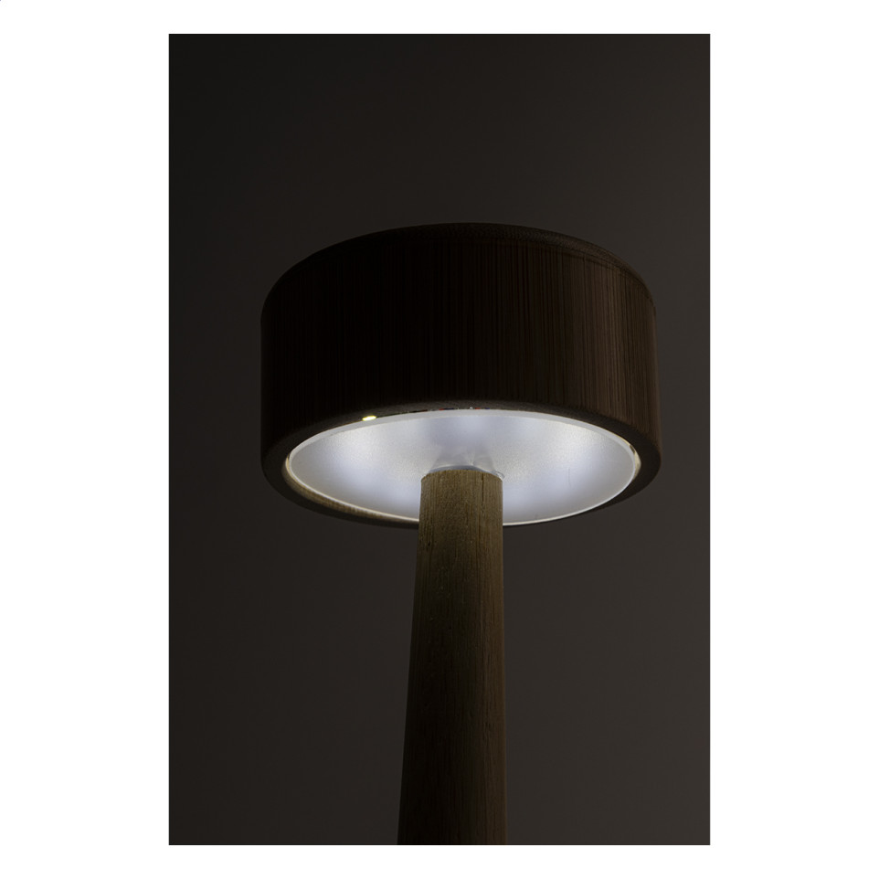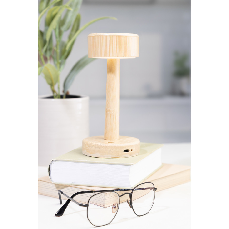 Lumboo natural bamboo table lamp provides versatile lighting for desks and workspaces. Features 24 LEDs powered by an 800 mAh USB rechargeable battery, with warm, natural, and cool light modes. Includes USB charger cable.