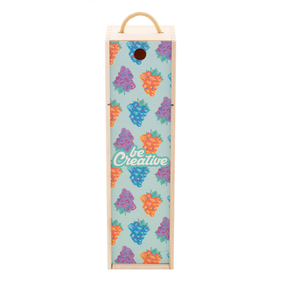 VinoBox is a custom-made wooden wine gift box featuring a cord handle and a full colour printed lid, ideal for presenting and gifting wine bottles at events or celebrations.