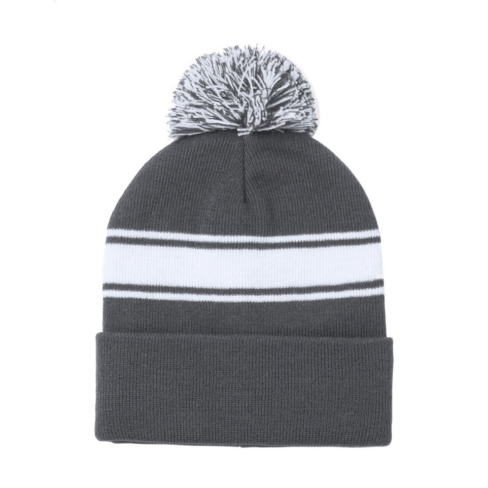 A frosty grey winter hat (AP781636-80) crafted from acrylic with distinctive white stripes and a matching grey pompom. Perfect for keeping warm during cold winter days while maintaining a stylish appearance.