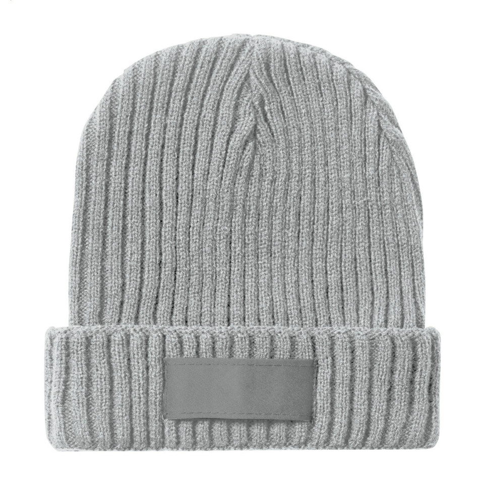 The Kinny light grey winter hat is a stylish acrylic knitted beanie featuring a printable patch. Perfect for keeping warm during cold winter days while showcasing your brand identity with a customizable design element.