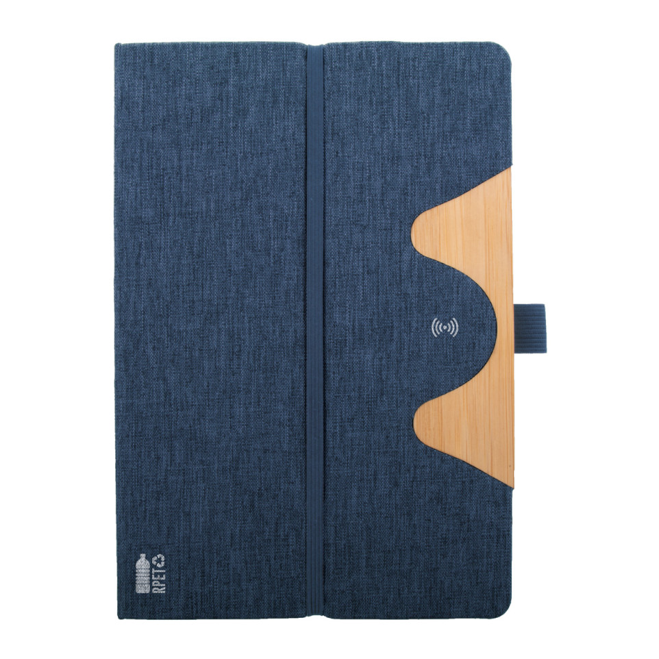 The Chatom dark blue RPET wireless charger notebook is an A5-size notebook featuring 80 lined sheets of recycled paper, a bamboo insert, a mobile holder function, and a built-in 15W wireless fast charger. Designed for efficient daily use in the office, during meetings, or while traveling.