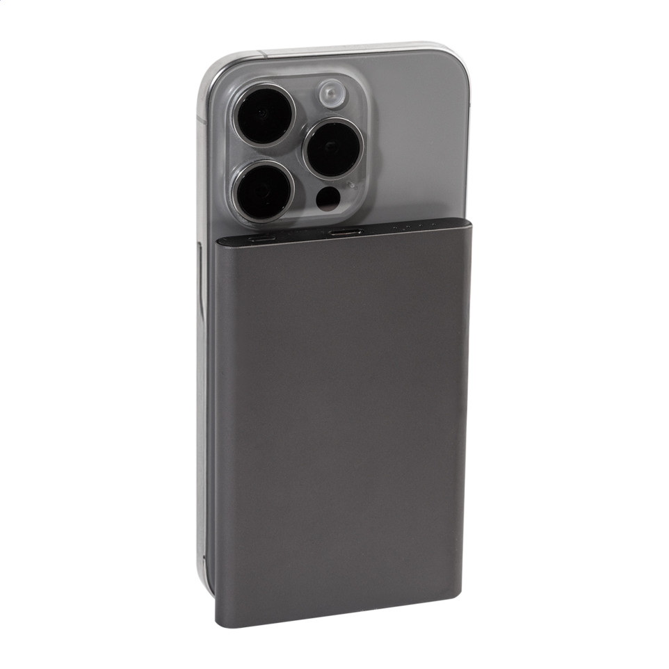 RaluStick grey power bank (Ref: AP864051-80) features a 5000 mAh battery with built-in 15 W magnetic wireless fast charger. Charge compatible devices on the go using USB-C ports and included cable, ideal for daily mobility.