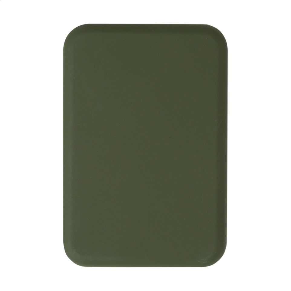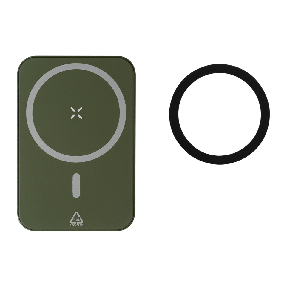 Recycled ABS power bank in dark green with 5000 mAh battery and built-in 5W magnetic wireless charger. Charge compatible devices on the go using USB-C input/output or magnetic attachment. Dimensions: 64 x 98 x 16 mm; weight: 125 g.