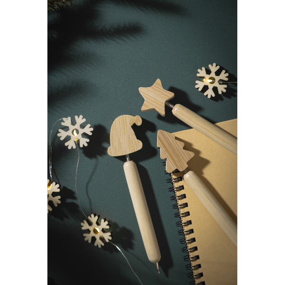 Bamboo ballpoint pen featuring a festive Christmas cartoon figure on top, designed with a Santa hat. Includes a blue ink refill. Suitable for seasonal gifting, promotional campaigns, and office or retail environments during the holidays.