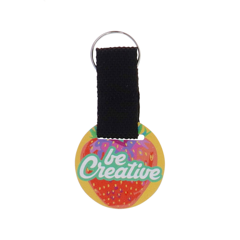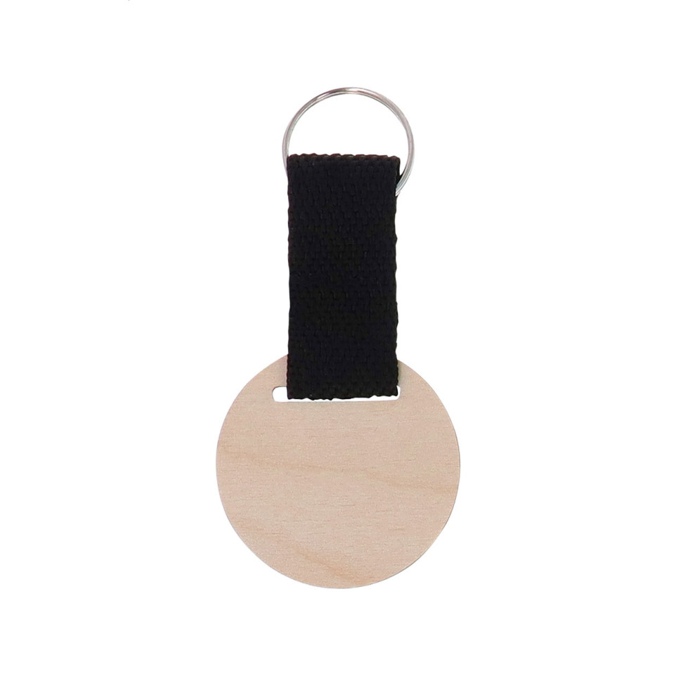 Elegant birch plywood keyring featuring a durable polyester strap and round design. This versatile promotional item combines natural wood aesthetics with full-color customization options for impactful brand visibility.
