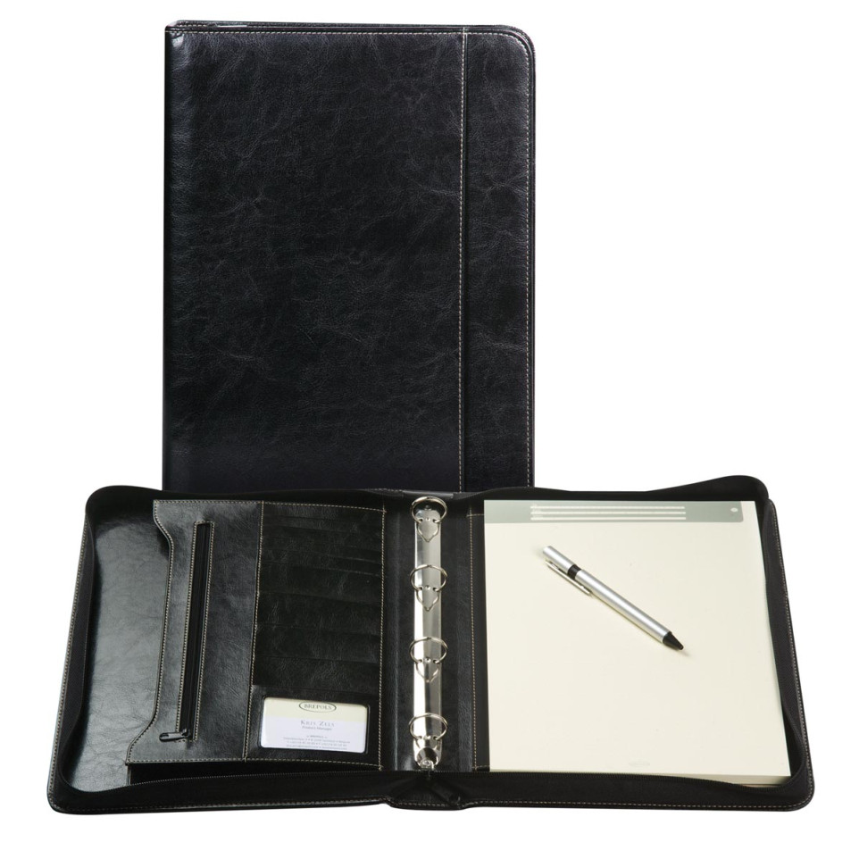 This writing case is ideal for organizing documents and notes during meetings. It includes a notebook and various compartments for storing pens, business cards, and loose sheets.