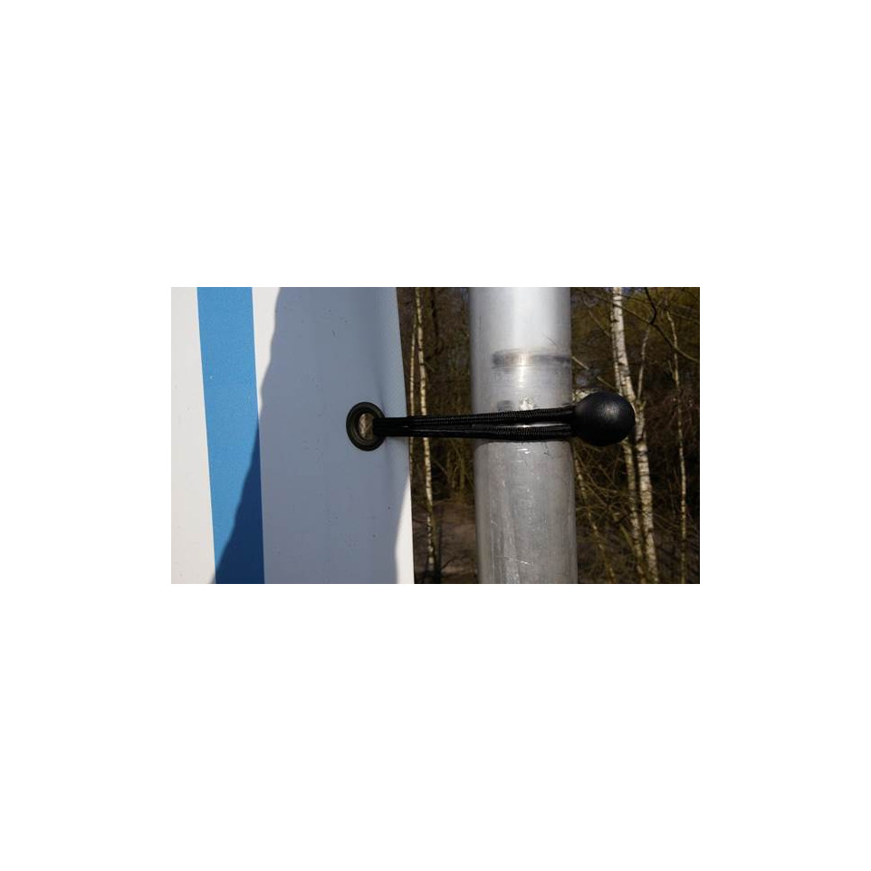 Il suffit d’insérer l’élastique dans un œillet de la bâche, puis de passer la boule à travers la boucle formée pour assurer une fixation stable.