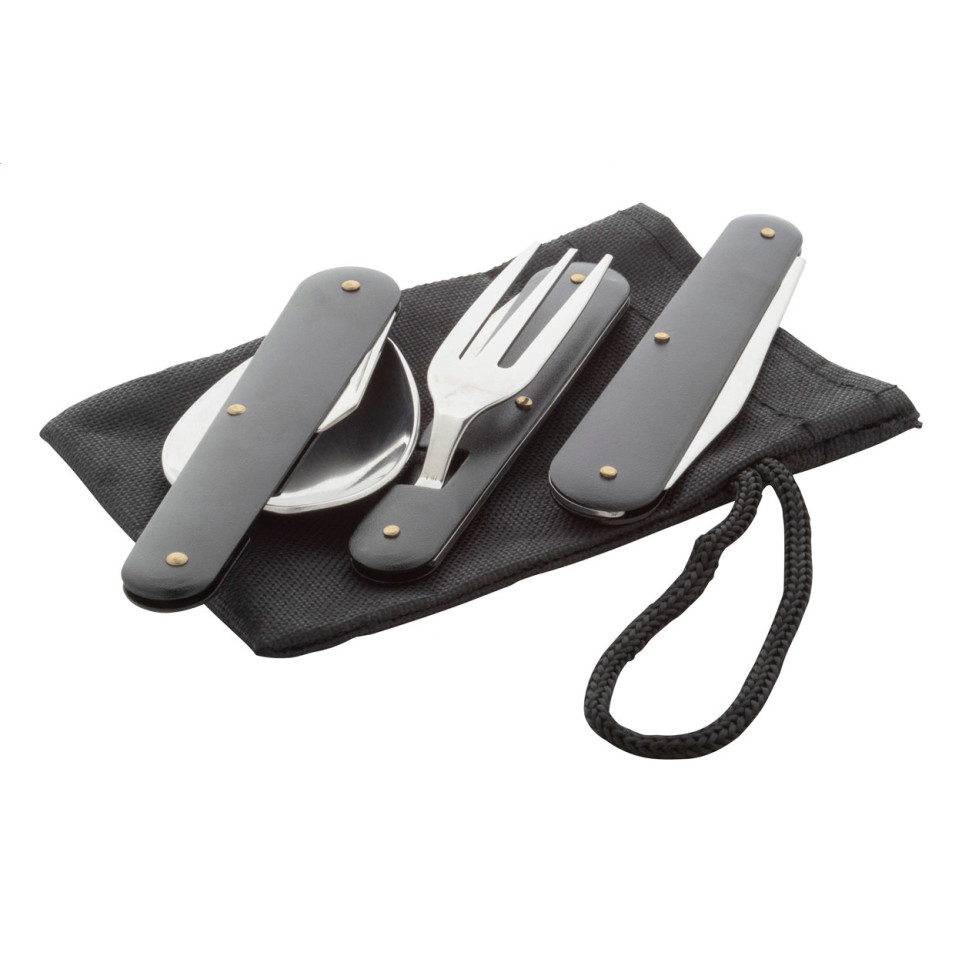 Ce set de couverts de camping pliables "Platoon noir" est conçu pour les repas en plein air. Compact et fonctionnel, il comprend tout le nécessaire pour vos aventures en extérieur dans un étui noir pratique.