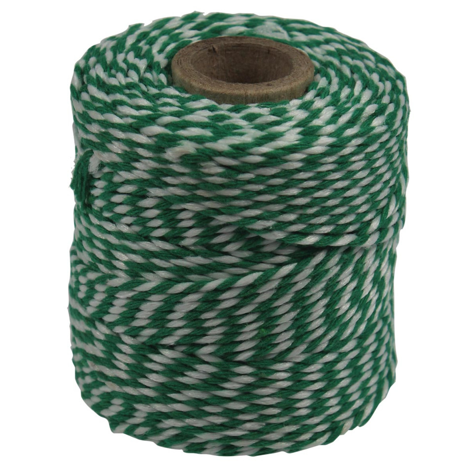 Ficelle de coton vert-blanc sur bobine de 50 g, longueur d’environ 55 m, conçue pour l’emballage et la sécurisation d’objets. Idéale pour les besoins professionnels ou domestiques liés à l’expédition.