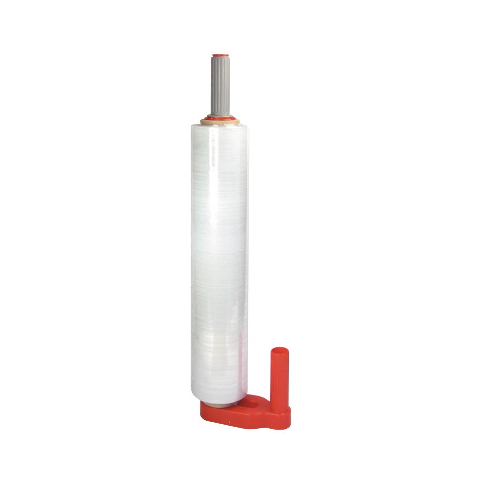 Distributeur en plastique rouge conçu pour faciliter l’emballage manuel de palettes et de grands envois. Convient aux rouleaux de film avec un noyau de 50 mm, idéal pour les tâches de logistique et de manutention.