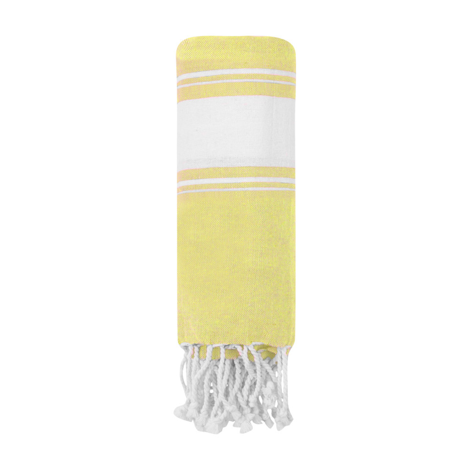 La serviette de plage paréo Oreti jaune est un accessoire bicolore polyvalent en polycoton, idéal pour les activités extérieures, les journées à la plage ou comme élément décoratif près d'une piscine.