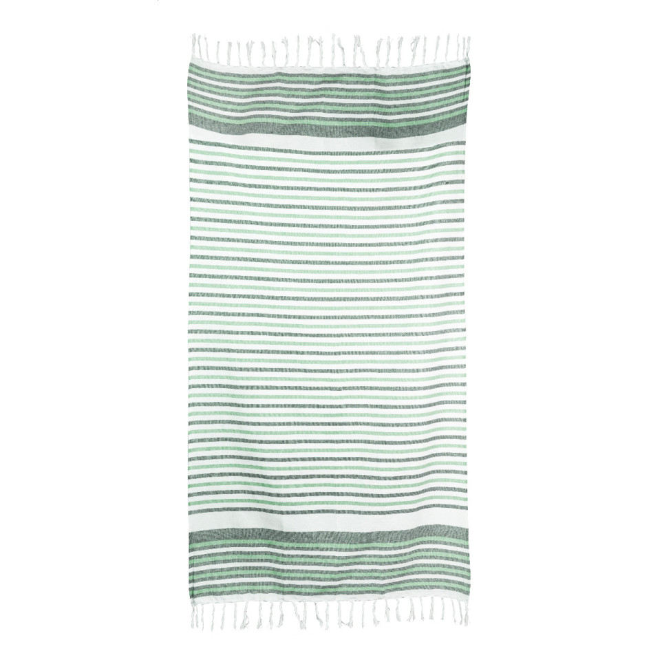Serviette de plage paréo élégante, à rayures tricolores vertes, idéale pour accompagner détente, loisirs en extérieur ou activités balnéaires. Usage polyvalent : serviette, paréo ou couverture légère.