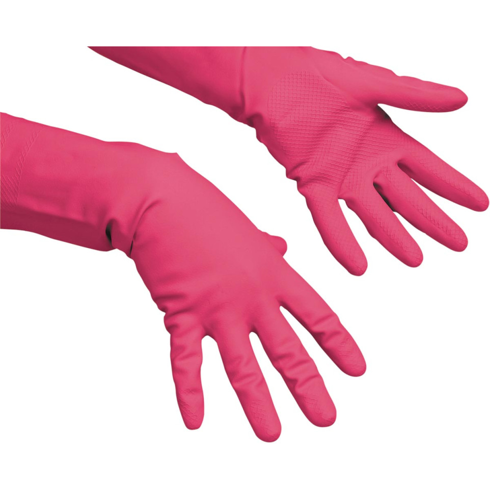 Gants en latex naturel de petite taille, couleur rouge rose, conçus pour les tâches ménagères quotidiennes et les manipulations nécessitant une protection contre les produits chimiques ménagers. Adaptés pour un usage domestique polyvalent grâce à leur flexibilité et leur confort.