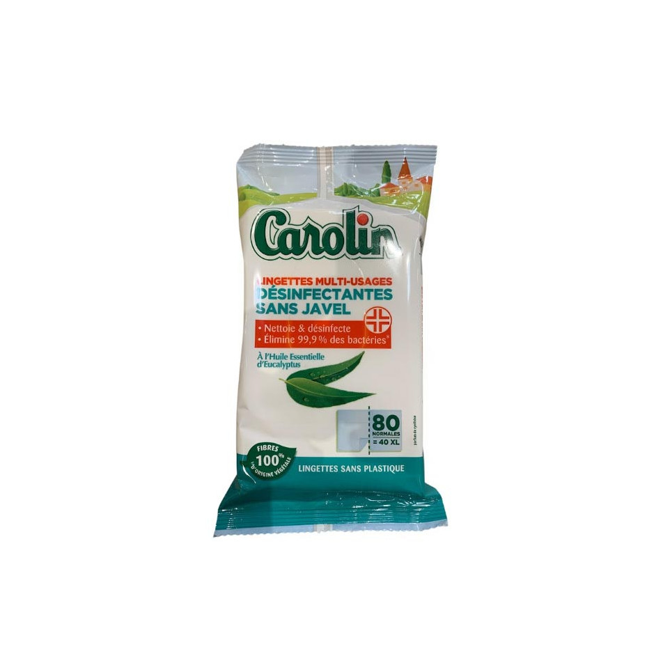 Lingettes humides Carolin à l'huile essentielle d'eucalyptus, conçues pour nettoyer, désinfecter et purifier toutes les surfaces de la maison. Paquet pratique de 80 lingettes extra-larges, équivalent à 160 lingettes standard.