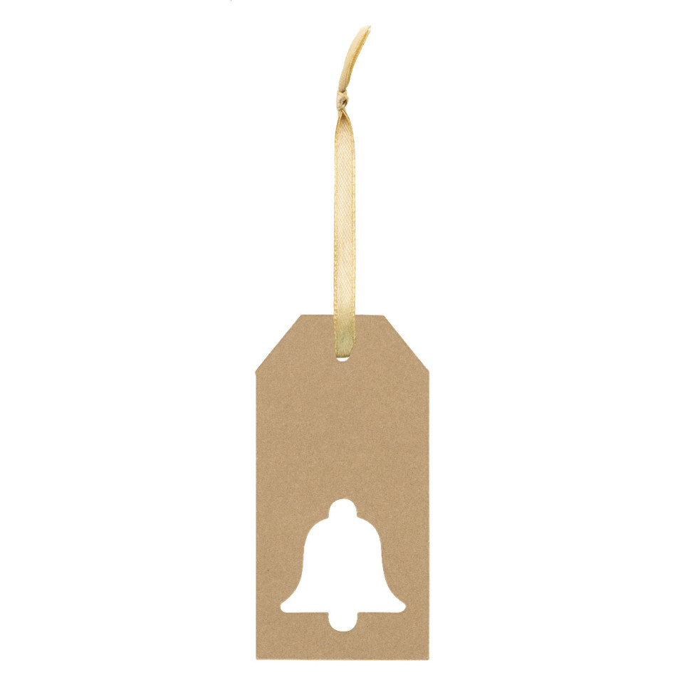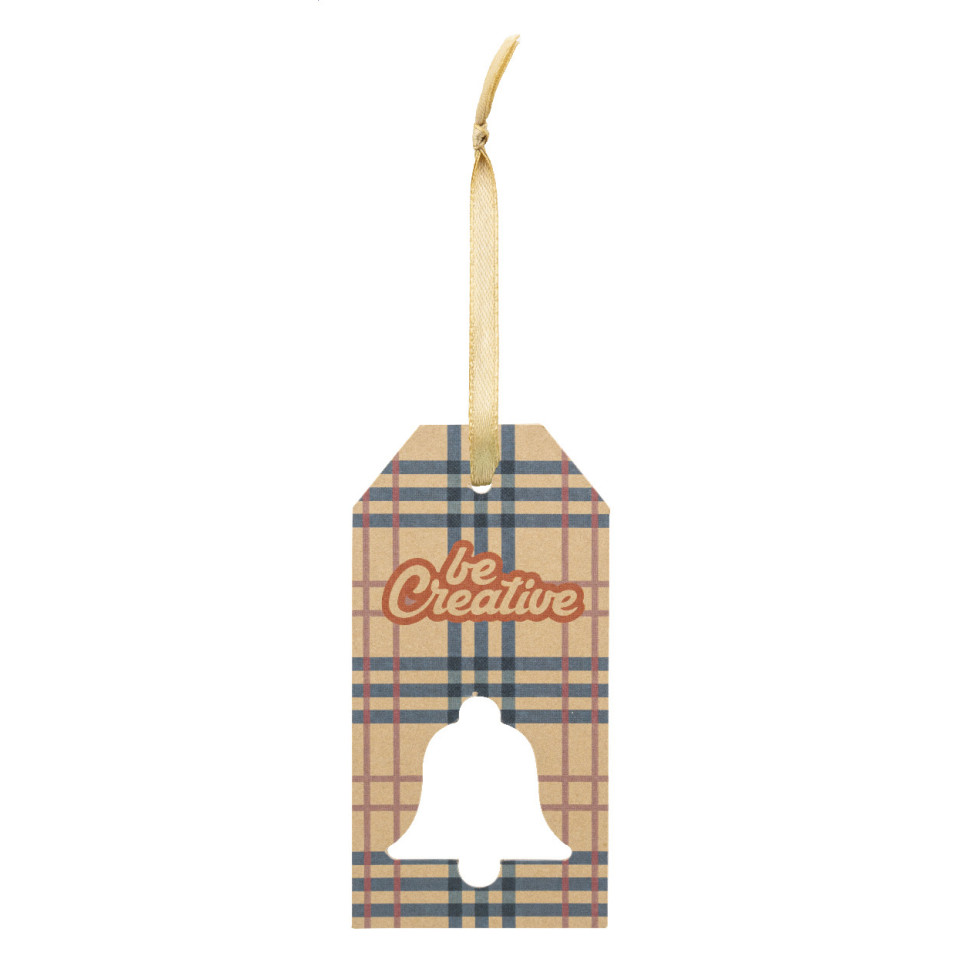 Étiquette cadeau de Noël blanche, réalisée en papier kraft, personnalisable avec impression numérique quadri sur une face, motif de Noël découpé et finition avec ruban doré. Idéale pour accompagner les cadeaux d’entreprise lors d’événements, fêtes ou opérations promotionnelles.