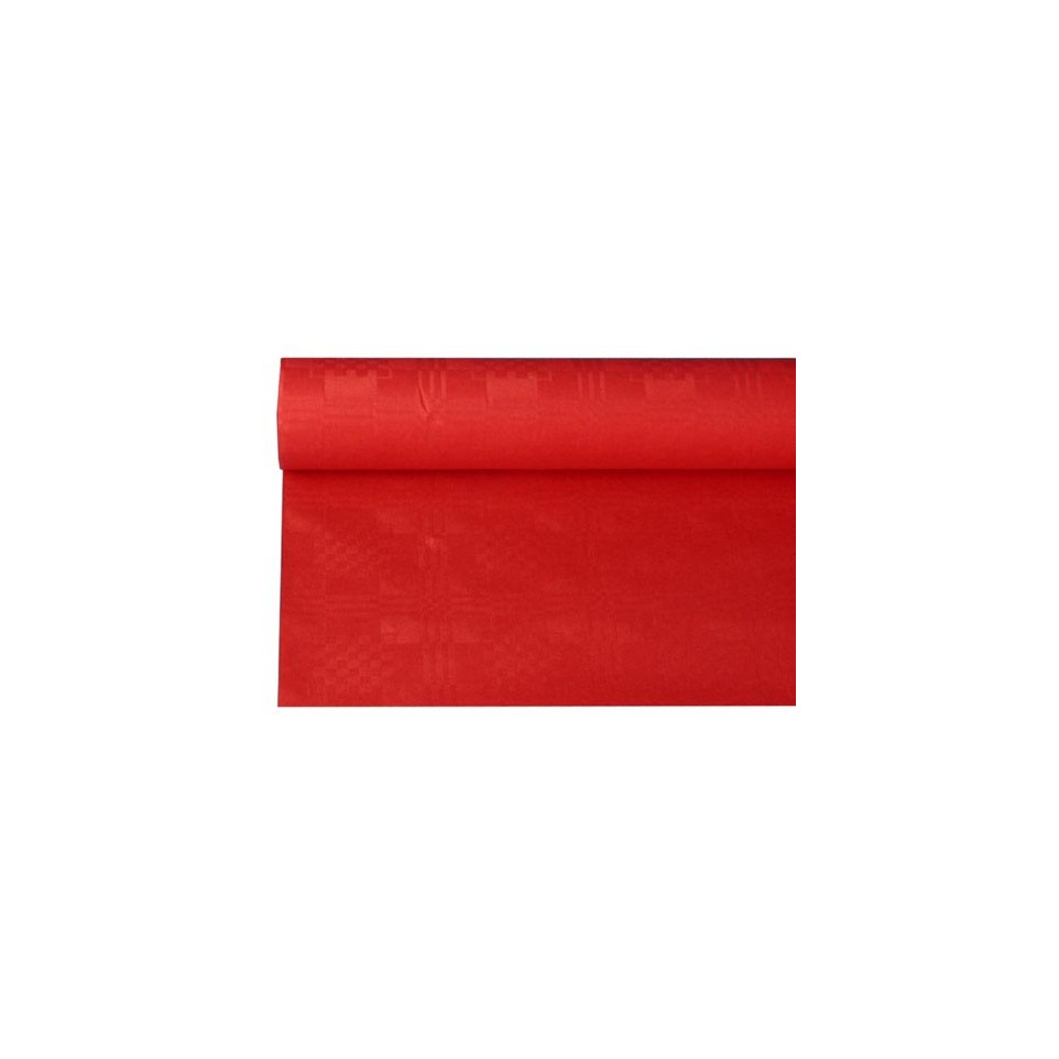Nappe en papier imprimé damassé sur rouleau, mesurant 1,2 x 8 mètres, de couleur rouge éclatante. Conçue pour habiller élégamment les grandes tables lors de réceptions, événements ou services en restauration.