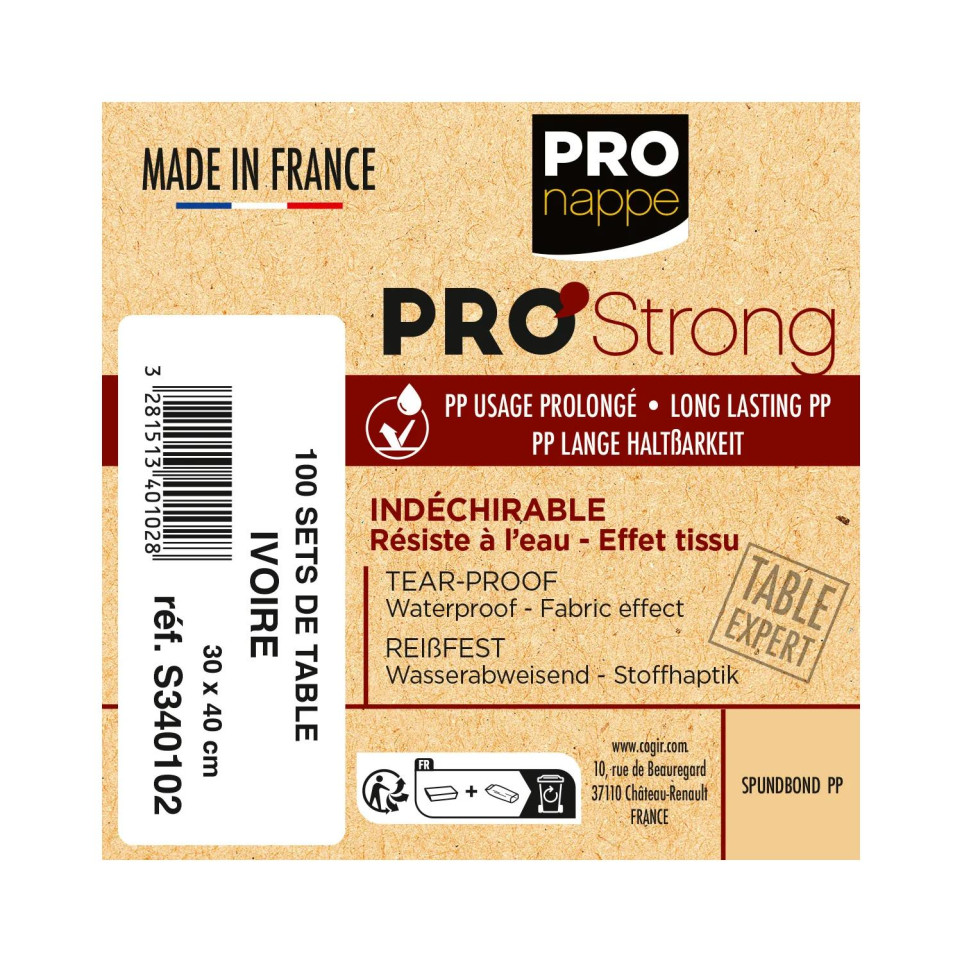 Barquette de 100 sets de table spundbond, unis - Format 30x40cm La marque Pro Nappe vous propose des produits de convivialité nappes, serviettes, assiettes, gobelets coordonnés aux couleurs vives et tendances pour recevoir de la meilleure façon. Ces sets de table en matière non tissée trés qualitative vous offrent un tombé parfait proche du tissu. Indéchirables, déperlants et éssuyables, ces produits permettront à vos tables de rester intactes longtemps. L'effet haut de gamme mettra votre vaisselle et votre décoration en valeur sur votre table en restaurant comme chez vous, en toutes occasions : fêtes d'anniversaires, banquets, mariages, baptêmes, noël. Produits fabriqués en France et recyclables. Teintés dans la masse, l'encre, adaptée, ne déteint pas et ne décolore pas à la lumière. En barquette de 100 sets de table.