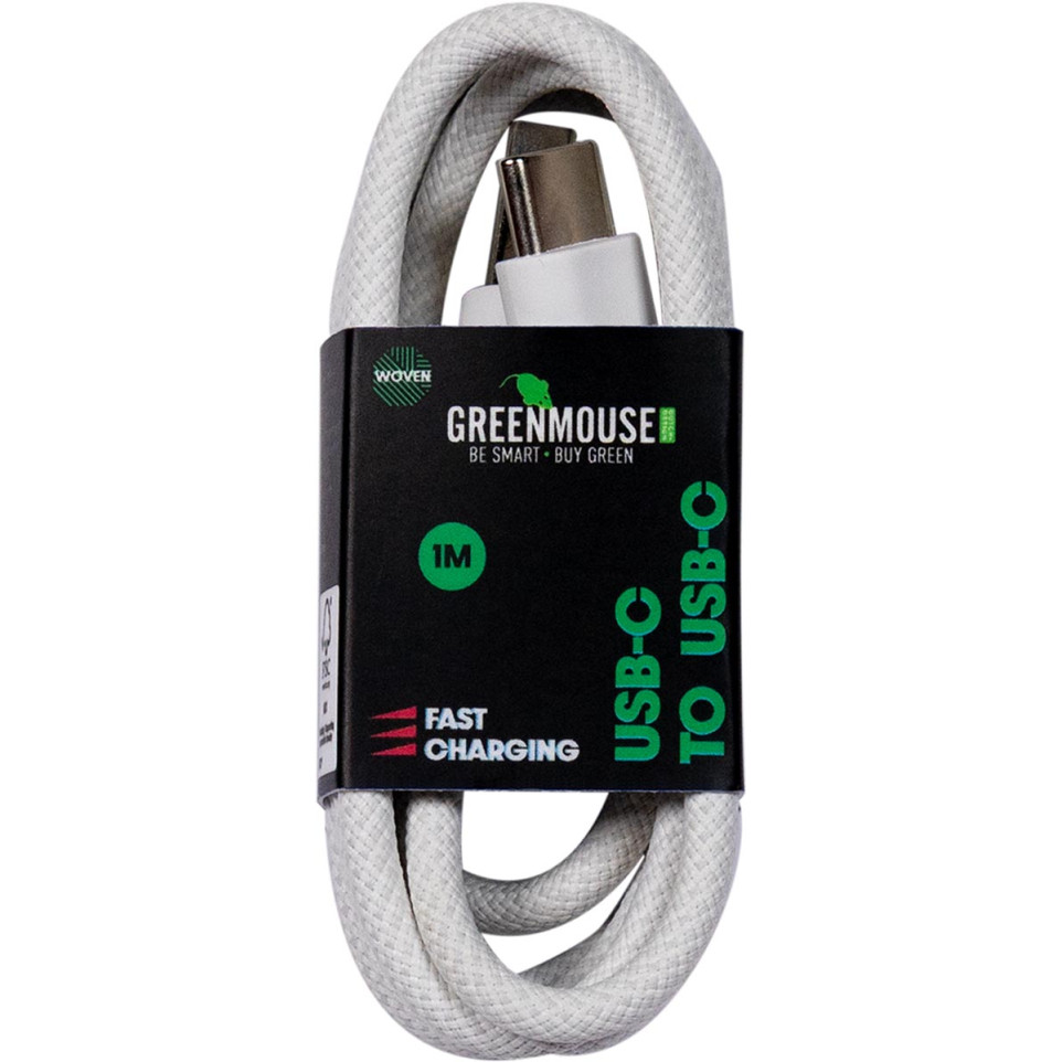 Le câble USB-C vers USB-C Greenmouse (1 m) permet de connecter et de recharger des smartphones, tablettes et autres appareils compatibles USB-C, avec une conception tissée robuste et écoresponsable.