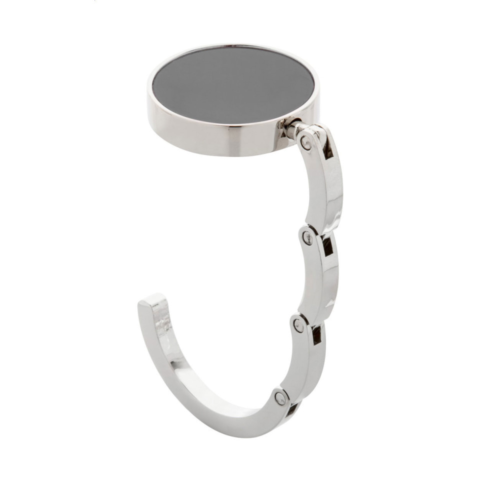 Accroche-sac en métal finition noir argenté, présenté dans une élégante boîte cadeau noire. Idéal pour garder un sac à portée de main et hors du sol dans les lieux publics ou au bureau.
