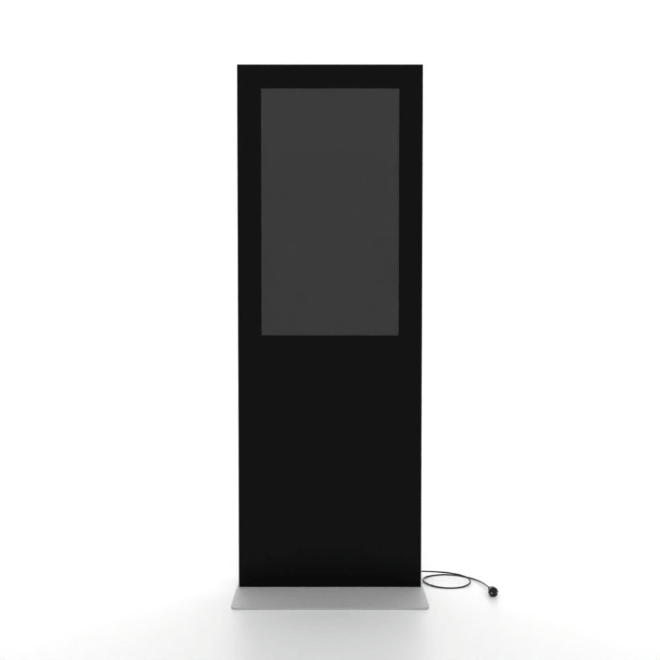 Le totem se branche sur secteur et s’intègre dans un espace intérieur. Il permet l’affichage de contenu animé ou statique, identique ou différent sur chaque face, via système de gestion de médias. Convient pour signalisation événementielle, promotion produit ou information directionnelle.