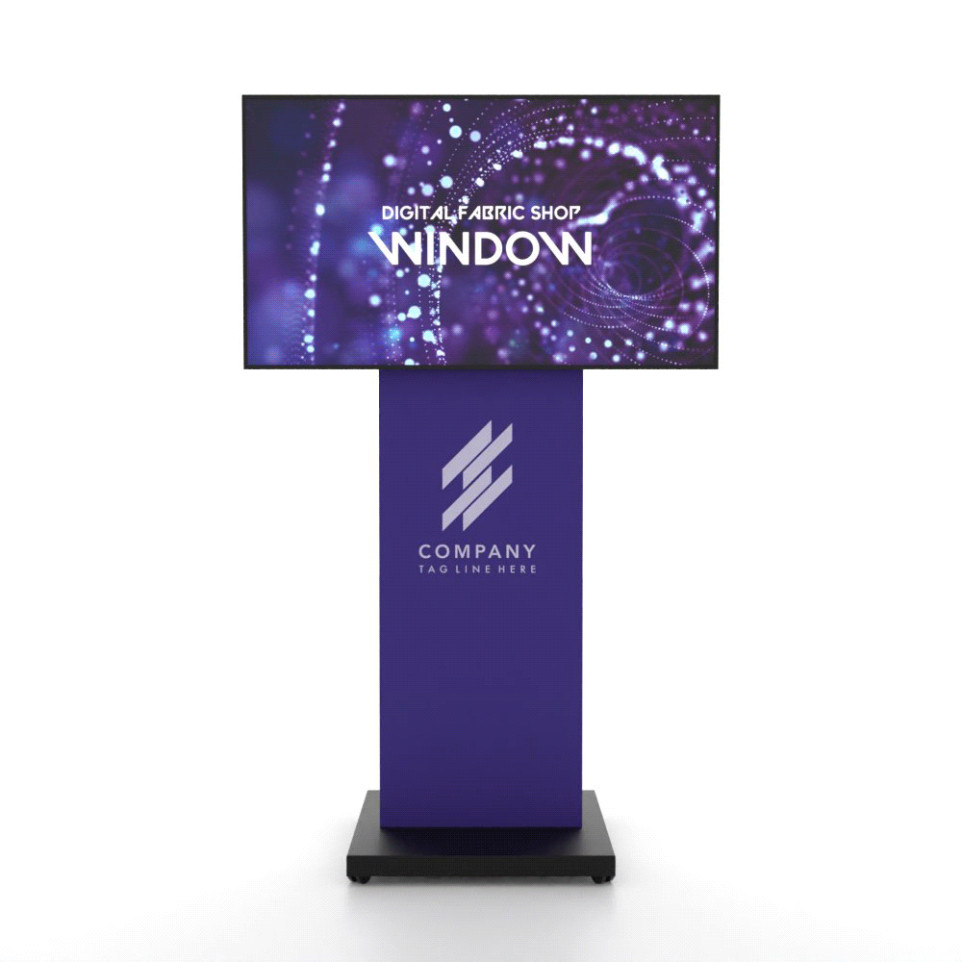 Fenêtre numérique avec tissu pour vitrine intégrant un moniteur QM55C équipé d’un système TFR30 double face. Idéal pour attirer l’attention dans les espaces commerciaux, ce dispositif propose une expérience d’affichage dynamique et moderne.