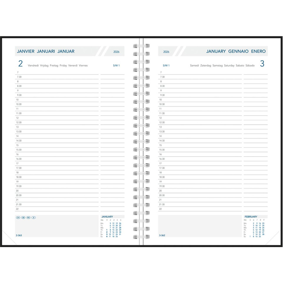Agenda de comptoir Aurora Daily 32W, conçu pour une organisation quotidienne efficace : chaque jour de l’année apparaît sur une page distincte, y compris samedis et dimanches, pour un suivi précis de vos activités.