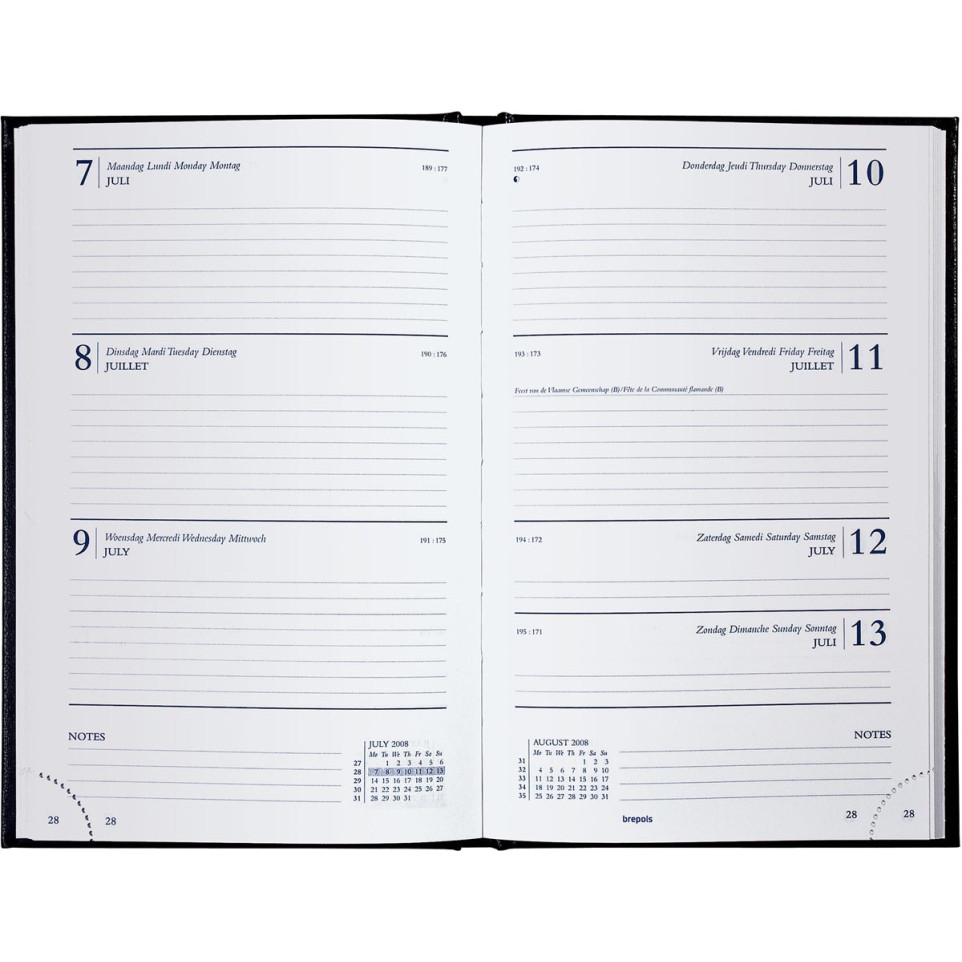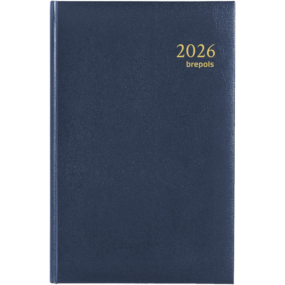 Agenda de comptoir Brepols Saturnus Lima bleu 2026, format pratique 133 x 210 mm, conçu pour organiser une semaine sur deux pages, adapté à un usage professionnel ou personnel nécessitant une visibilité claire et multilingue de l’emploi du temps.