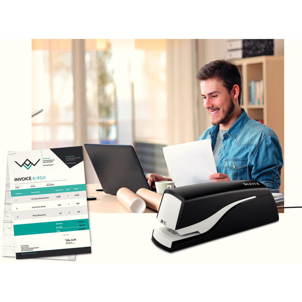 L’agrafeuse électrique Leitz Nexxt 1mm noire est conçue pour un usage fréquent en bureau ou à domicile. Elle permet d’agrafer rapidement jusqu’à 10 feuilles de papier standard, tout en garantissant une manipulation facile d’une seule main.