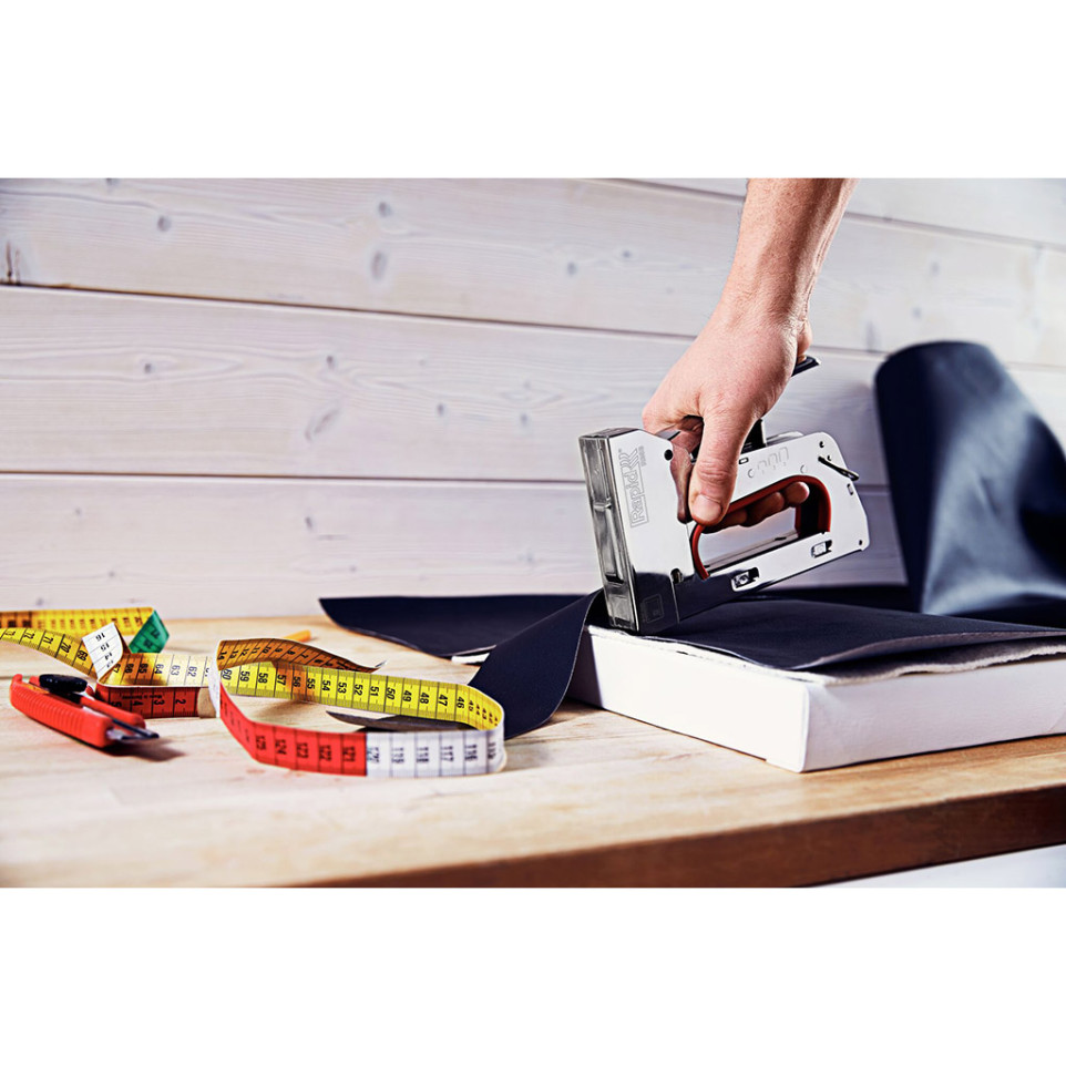 Insérez les agrafes n°53 dans le magasin, sélectionnez la puissance adaptée sur la molette, puis positionnez et appuyez sur la poignée pour agrafer tissu, toile ou autre support. Le système anti-rebond offre un confort supplémentaire, même lors d’utilisations intensives.