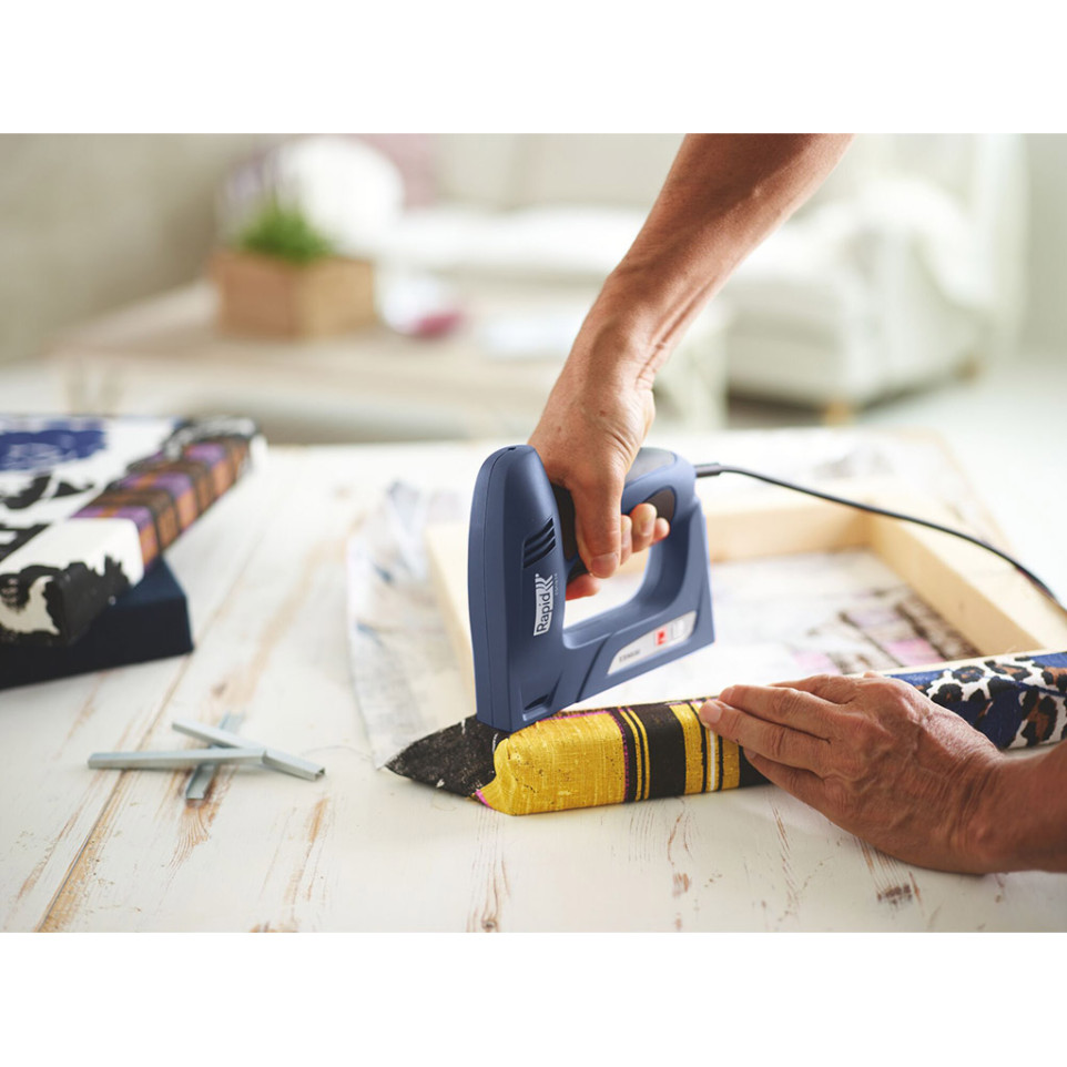 Agrafeuse électrique maniable et puissante, la Rapid ESN530-NEW-HANDY est conçue pour fixer efficacement tissu, cuir, moquette ou bois fin. Idéale pour les travaux de rénovation et d’ameublement, elle s’utilise d’une seule main pour travailler aisément et rapidement.